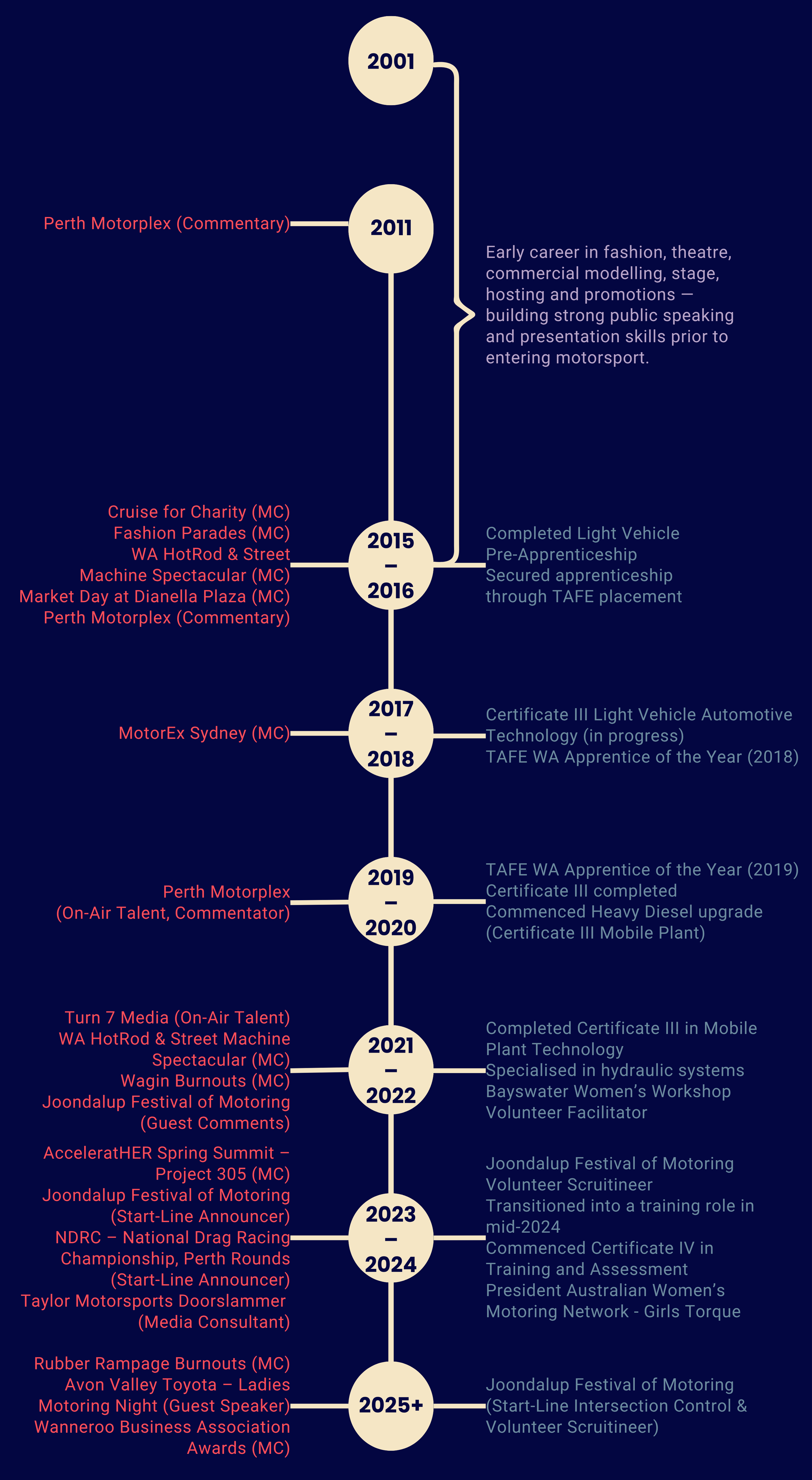 Beyond the tools and the track, Bridget was selected to lead Girls Torque – Australian Women’s Motoring Network, an initiative with a 25-year history of supporting women in the automotive and motorsport industries. She brings her lived experience to drive real opportunities for Australian women in the field. With over a decade behind the mic and a trade career under her belt, Bridget offers rare insight and grounded credibility. She mentors women stepping into media and automotive spaces — and she’s ready to pass on the microphone.